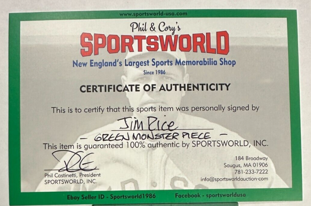 We're offering this Authentic Piece of the Green Monster in Fenway Park Autographed & Inscribed with "MVP 78" by Hall of Fame Outfielder Jim Rice of the Boston Red Sox. It's measures approx. 2" x 3" and it comes with a COA issued by Sportsworld, New England's Largest Sports Memorabilia Store and is guaranteed to be 100% authentic.