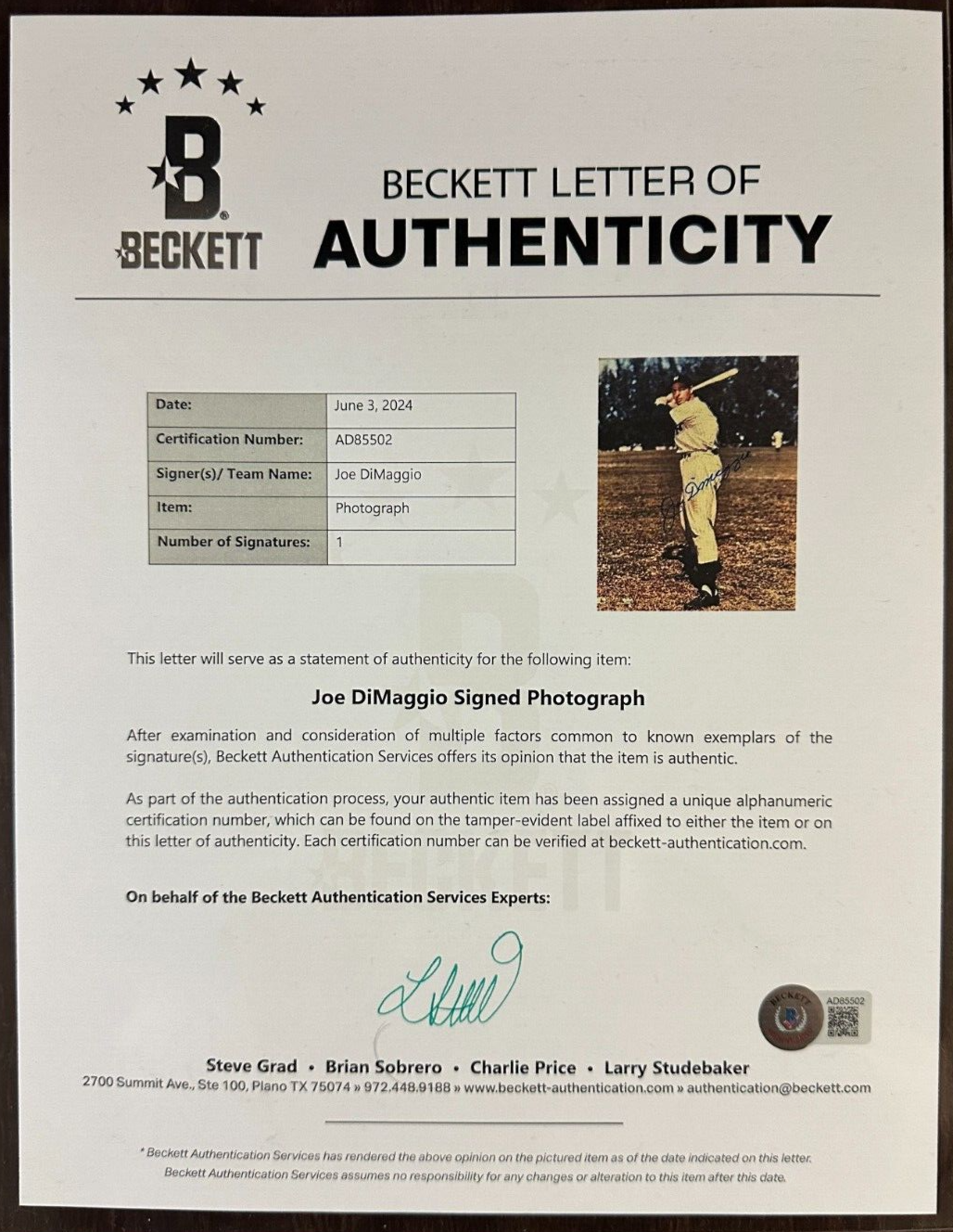 We're offering this 8" x 10" Photo Autographed by Baseball Hall of Famer Joe DiMaggio of the New York Yankees. It comes with a Full Letter COA & Matching Hologram issued by BAS Beckett Authentication Services (AD85502) and his signature is guaranteed to be 100% authentic. The photo is mounted on plaque along with a custom nameplate. We will combine on shipping for similar items!