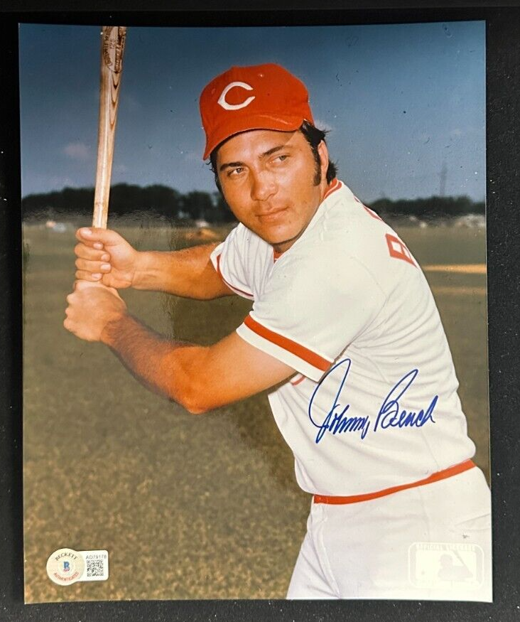 We're offering this 8x10 Photo Autographed by Baseball Hall of Fame Catcher Johnny Bench of the Cincinnati Reds. It comes with a Hologram issued by BAS (AD79178) Beckett Authentication Services and his signature is guaranteed to be 100% authentic. The photo is in nm condition.