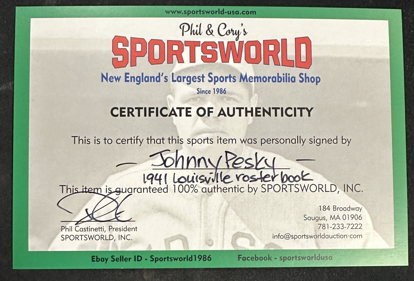 We're offering this Original Vintage 1941 Louisville Colonels Roster & Schedule Autographed by Boston Red Sox Legend Johnny Pesky. It's in nm condition, it comes with a COA issued by Sportsworld, New England's largest Sports Memorabilia Shop and his signature is guaranteed to be 100% authentic. We will combine on shipping for similar items!