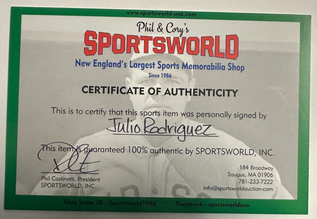 We're offering this 16" x 20" Photo Autographed by Outfielder Julio Rodriguez of the Seattle Mariners. It's in nm condition; it comes with a COA Sportsworld, New England's Largest Sports Memorabilia Store and his signature is guaranteed to be 100% authentic. We will combine on shipping for similar items!