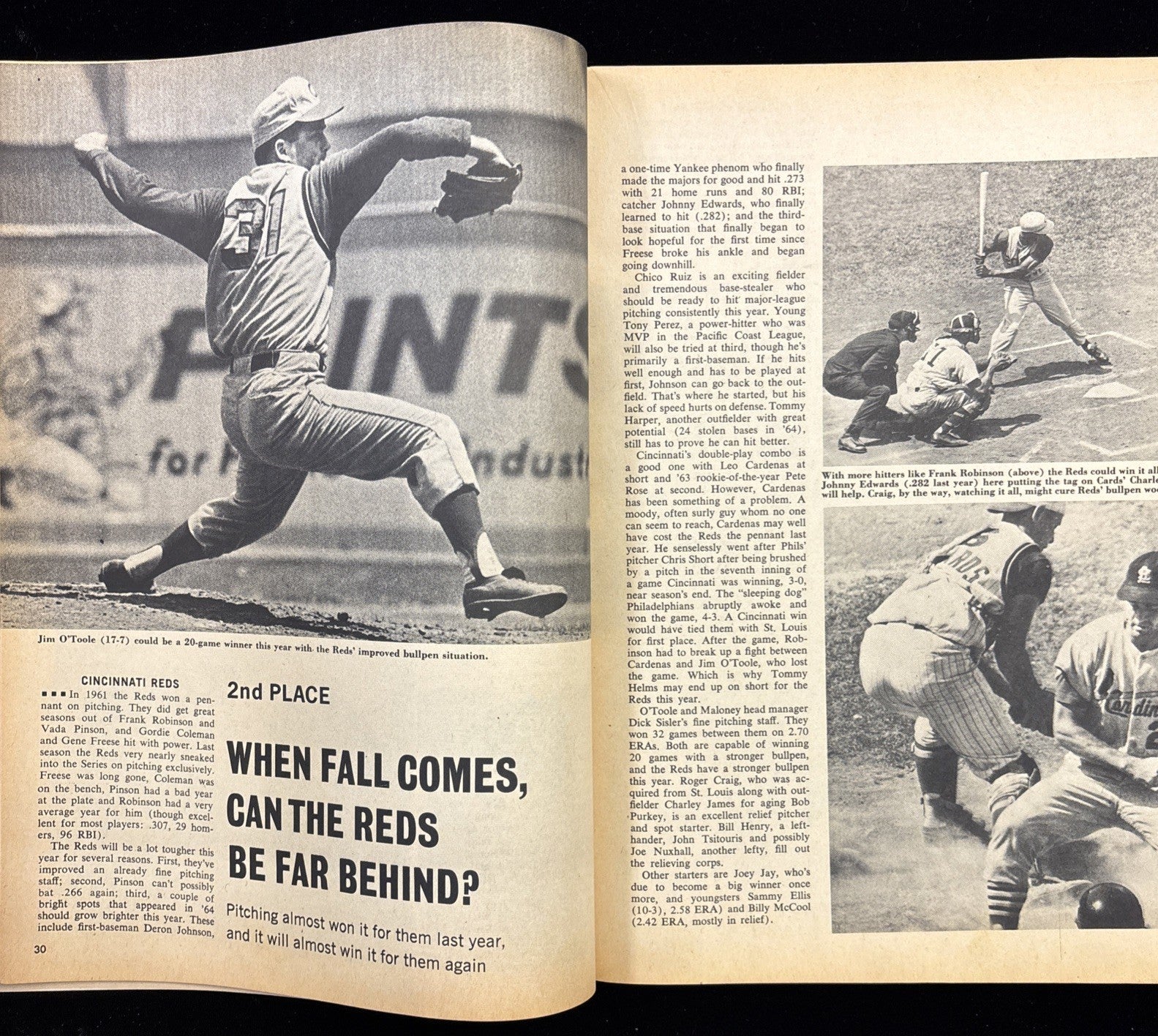 The product is a vintage June 1965 Official Baseball Sports Magazine featuring player Jim O’Toole from the Cincinnati Reds. This magazine provides a glimpse into the world of baseball during that time, with a focus on the Cincinnati Reds team. As a collectible item, it holds historical significance for fans of the sport and offers a unique perspective on the baseball industry in the mid-1960s.