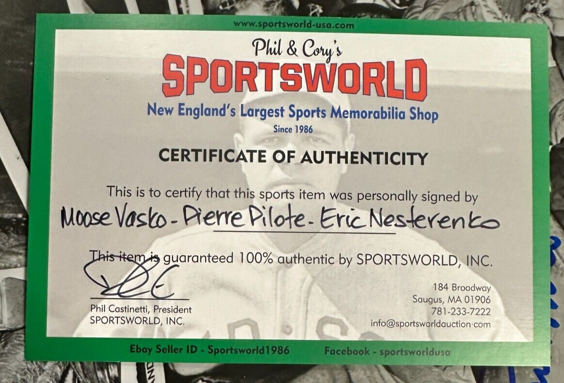 We're offering this 8" x 10" Photo Autographed by Chicago Black Hawks All-Stars Eric Nesterenko, Moose Vasko & Pierre Pilote. It comes with a COA issued by Sportsworld New England's Largest Sports Memorabilia Store and both signatures are guaranteed to be 100% authentic. The photo is in nm condition, and we will combine on shipping for similar items!