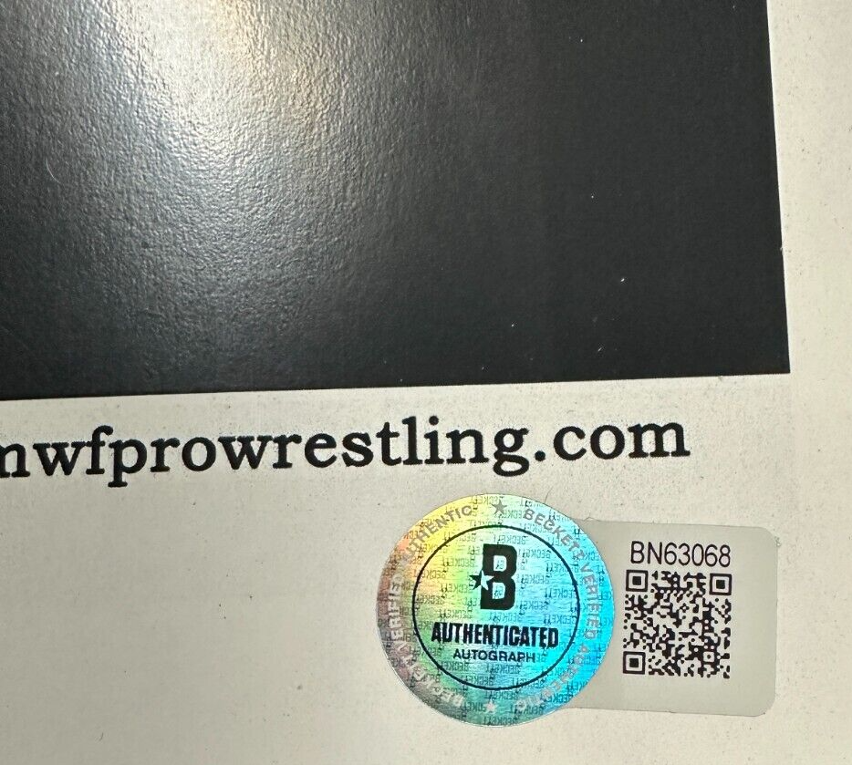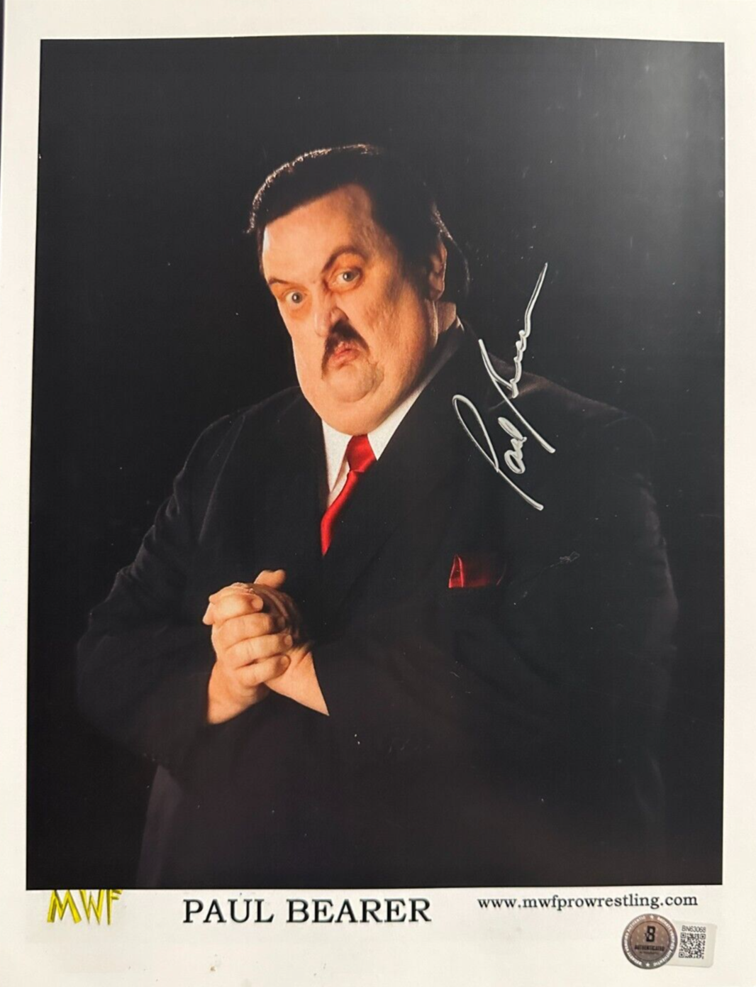 We're offering this Autographed original MWF Promo Photo of Legendary Wrestling Manager Paul Bearer. It comes with a hologram issued by BAS (BN63068) Beckett Authentication Services. It's in perfect condition and it measures approx. 8 1/2" x 11". It will be shipped in a protective plastic holder, and we will combine on shipping for multiple items