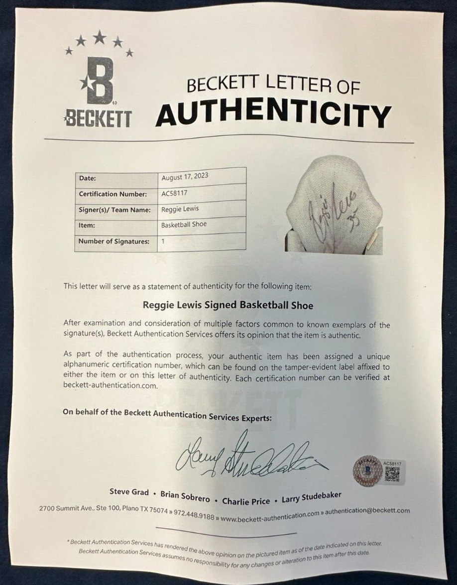 We're offering this Reebok Pump Sneaker worn by & Autographed on the inside of the tounge by former Boston Celtics All-Star the Late Reggie Lewis. The shoe is a size 16 and shows some game wear. It's in excellent condition; it comes with a Full Letter COA & Matching Hologram issued by BAS Beckett Authentication Services (AC58117) and his signature is guaranteed to be 100% authentic.