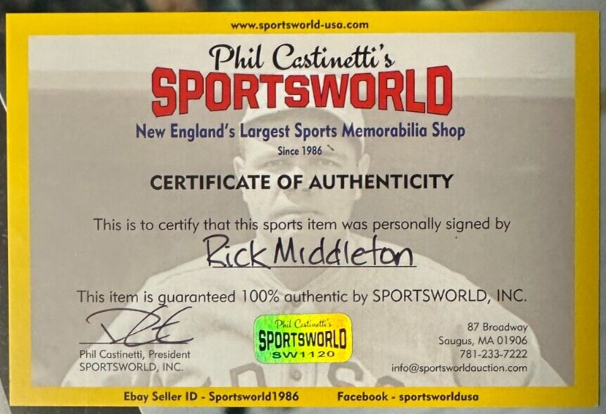 We're offering this 16x20 Photo Autographed & inscribed with "448 Goals" by Boston Bruins All-Star Rick Middleton. It comes with a COA issued by Sportsworld New England's Largest Sports Memorabilia Store and his signature is guaranteed to be 100% authentic. The photo is in nm condition.