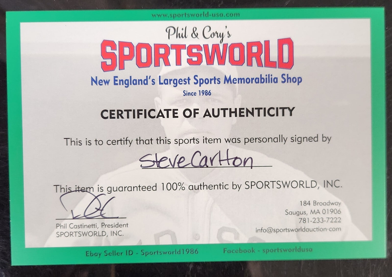 The COA is from Sportsworld- New England's largest sports memorabilia shop. Please refer to our pictures to be sure.
