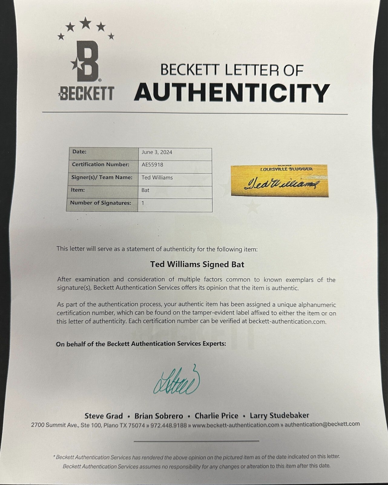 We're offering this Ted Williams Autographed Louisville Slugger Model Bat. It's beautifully signed on the barrel by Ted. It comes with a Full LOA & Hologram (AE55918) issued by BAS Beckett Authentication Services and his signature is guaranteed to be 100% authentic. We will combine on shipping for similar items!