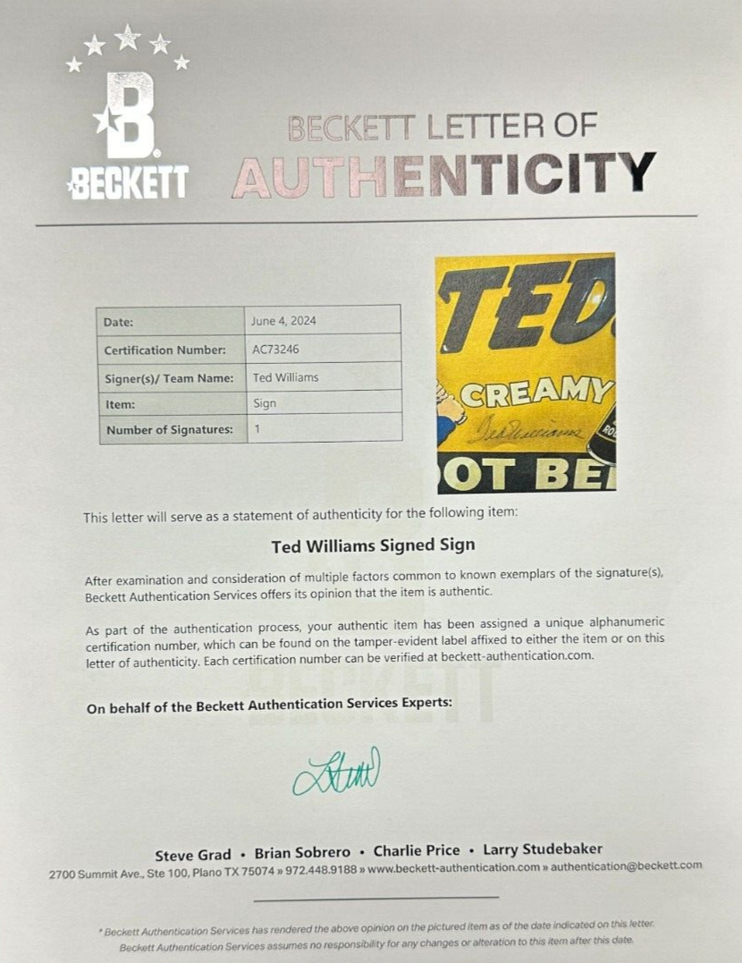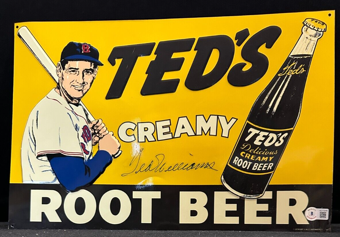 Ted Williams Autographed Ted's Creamy Root Beer Metal Sign BAS Red Sox HOF