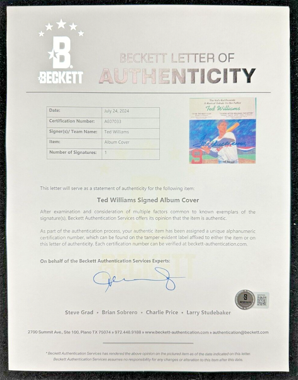 We're offering this 1989 45-RPM Record Titled The Kid's Kid Presents a Musical Tribute to her Father by Bobby Jo Williams Autographed by her Father Hall of Fame Outfielder Ted Williams of the Boston Red Sox. It's in nm condition, it comes with a Full Letter LOA & Matching Hologram Issued by BAS (AE07033) Beckett Authentication Services and his signature is guaranteed to be 100% authentic. We will combine on shipping for similar items!