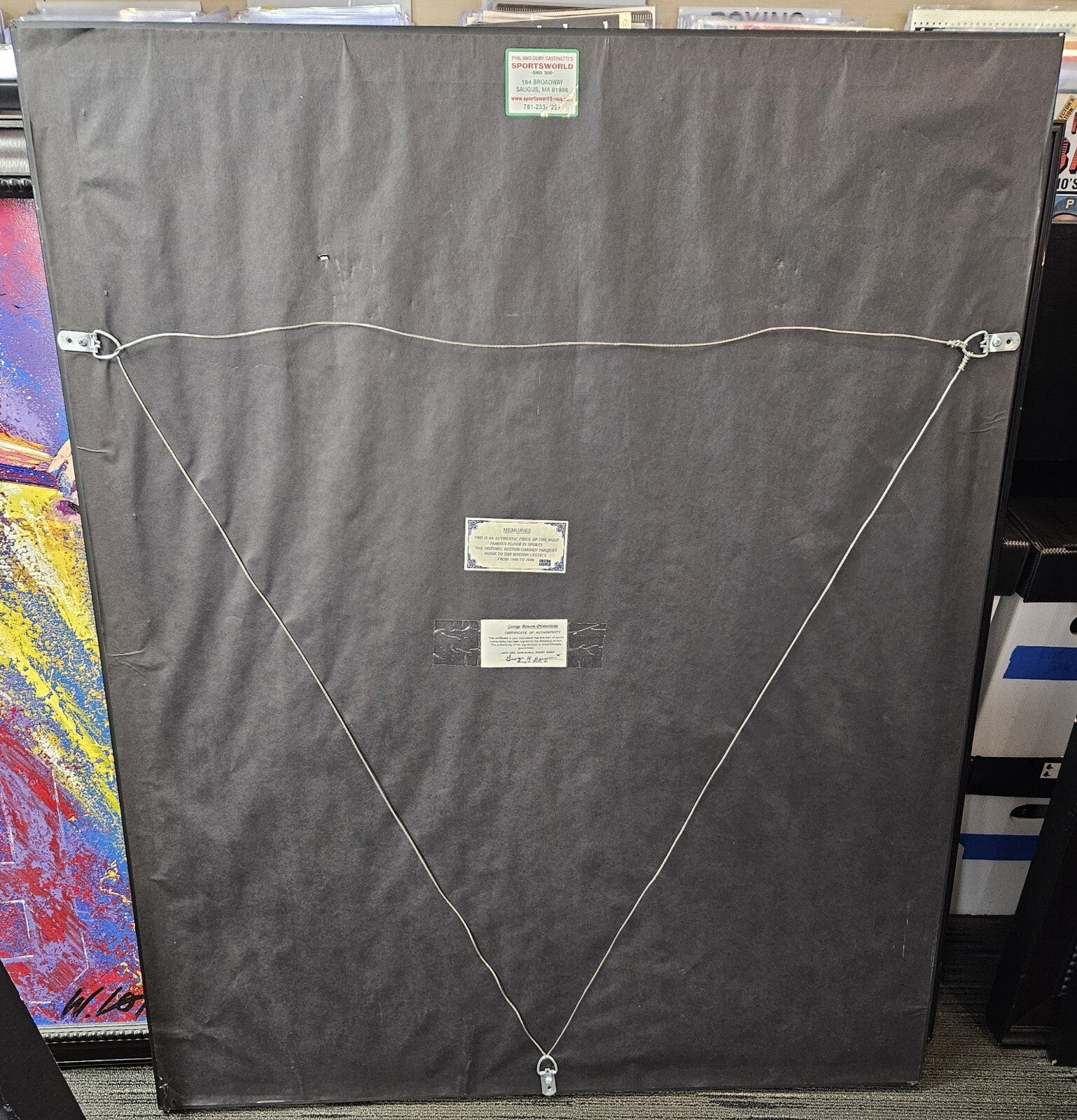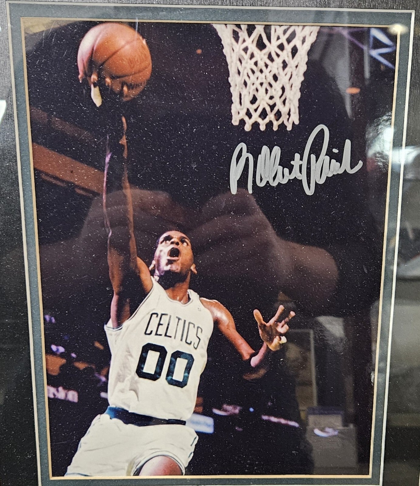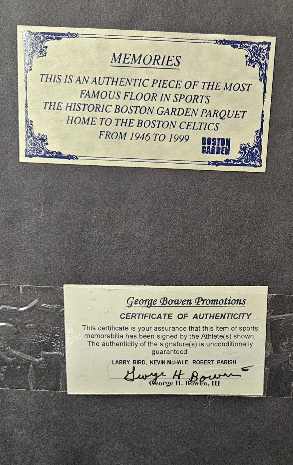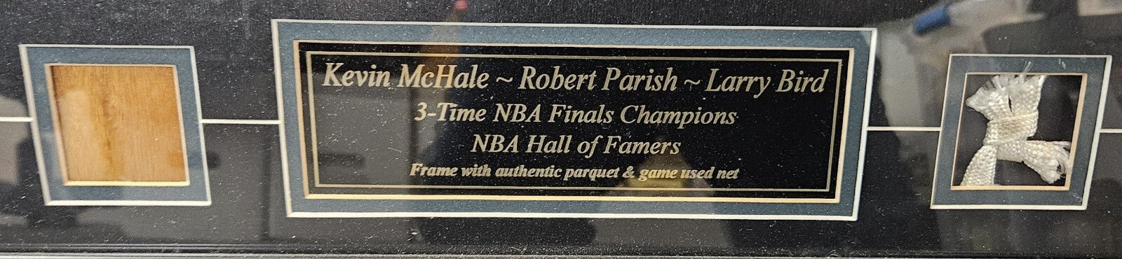 This custom framed photo features a 16x20 photo of three basketball legends from the Boston Celtics, Larry Bird, Robert Parish, and Kevin McHale. The individual signed 8x10 photos have been signed by Larry Bird, Kevin McHale, and Robert Parish and come with a certificate of authenticity from George Bowen Promotions. It is an original print and would make a great addition to any sports memorabilia collection. The photo is professionally framed and ready to be displayed. Also framed with the photos are a piece of the Boston Garden parquet floor and a piece of game used net. The frame measures 35x44.