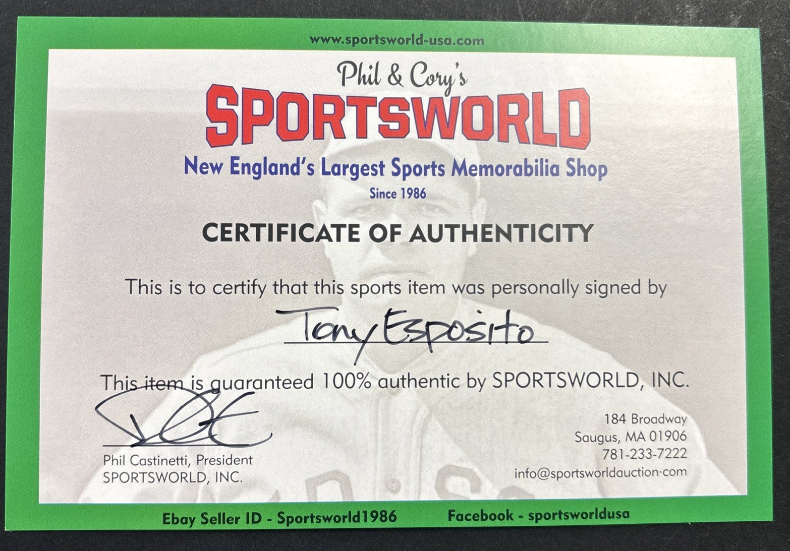 We're offering this autographed 16" x 20" Photo of Hall of Fame Goalie Tony Esposito of the Chicago Blackhawks. It's beautifully matted & framed. It comes with a COA Issued by Sportsworld, New England's Largest Sports Memorabilia Store and his signature guaranteed to be 100% Authentic. The entire piece measures Approx. 21" x 25" and we will combine on shipping for similar items!