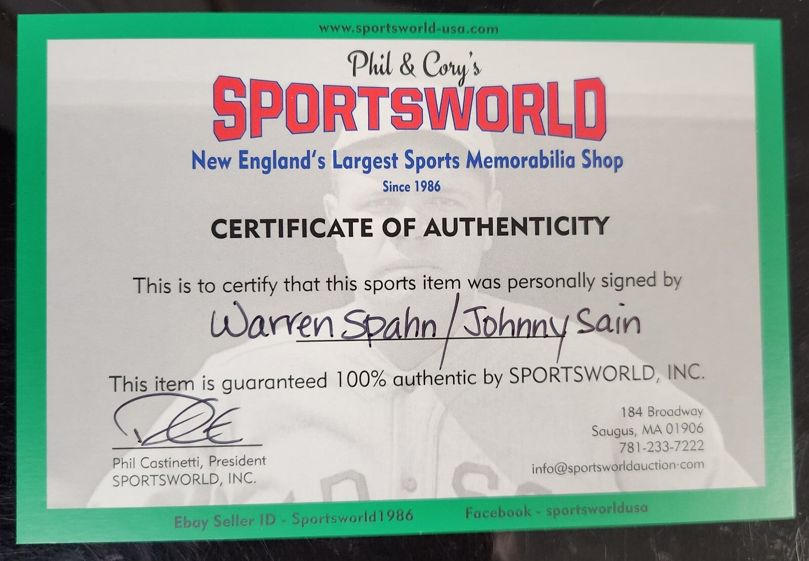 This 8x10 photo features baseball legends Warren Spahn (HOF) and Johnny Sain of the Boston Braves. Old Boston saying went "Spahn and Sain and pray for rain". The photo has been authenticated and comes with a PSA COA. Both players have signed the photo making it a great addition to any sports memorabilia collection. Whether you're a fan of the Boston Braves or just a fan of baseball history, this signed photo is a must-have. Perfect for displaying in your home or office, it's a timeless piece that captures the essence of America's favorite pastime.