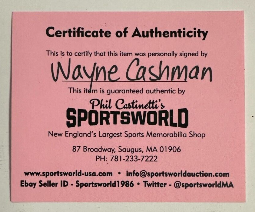 We're offering Official Boston Bruins Hockey Puck Autographed by former Bruins Captain Wayne Cashman. It's in nm-mt condition and it comes with a COA Issued by Sportsworld, New England's Largest Sports Memorabilia Store and his signature is guaranteed to be 100% authentic. It will be shipped in a plastic display square and we will combine on shipping for similar items!